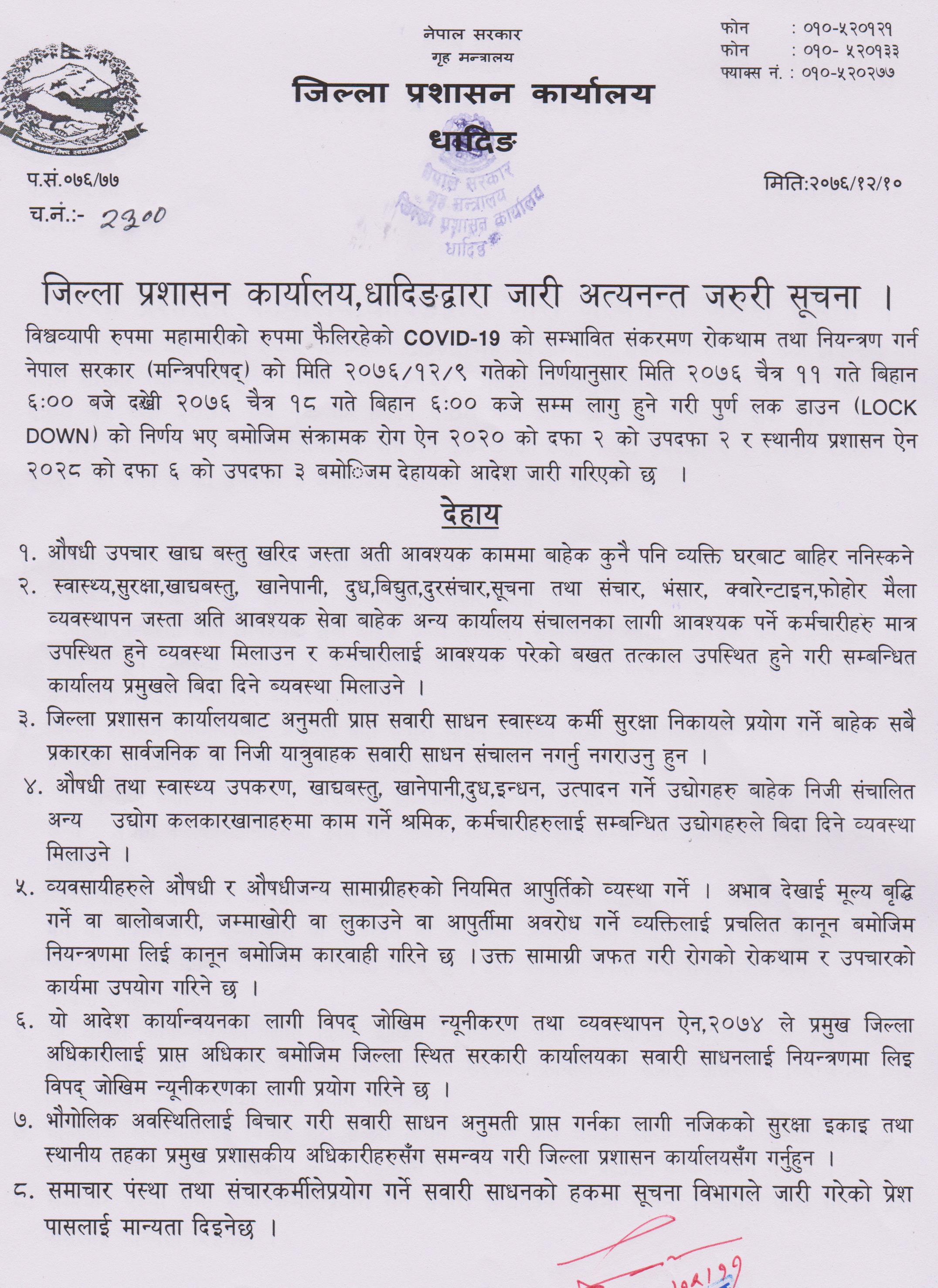 जिल्ला प्रशासन कार्यालय, धादिङबाट जारी निषेध आदेश