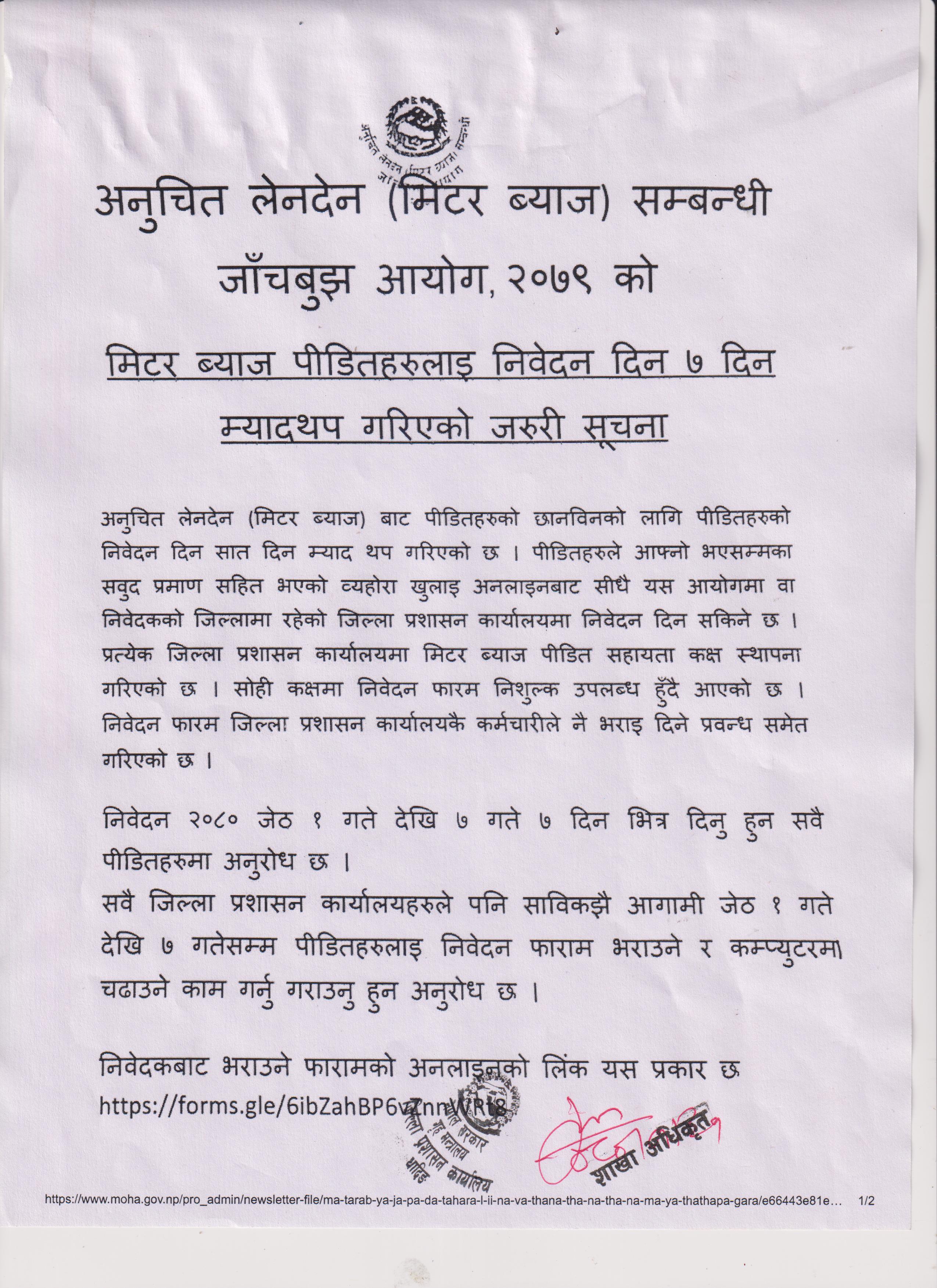 अनुचित लेनदेन (मिटर ब्याज) पीडितहरुलाई दिन ७ दिन म्याद थप गरिएको सूचना