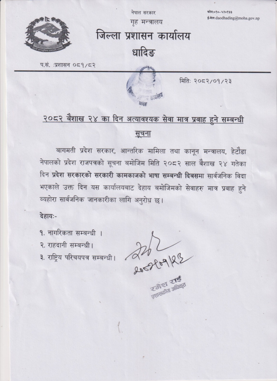 जिल्ला प्रशासन कार्यालय, धादिङद्धारा जनहितमा जारी सूचना ।