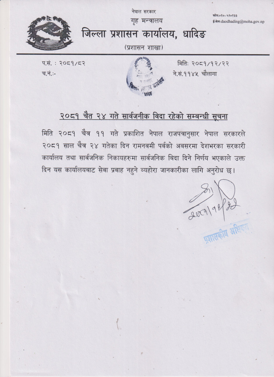 २०८१ चैत २४ गते सार्वजनिक विदा रहेको सम्बन्धी सूचना