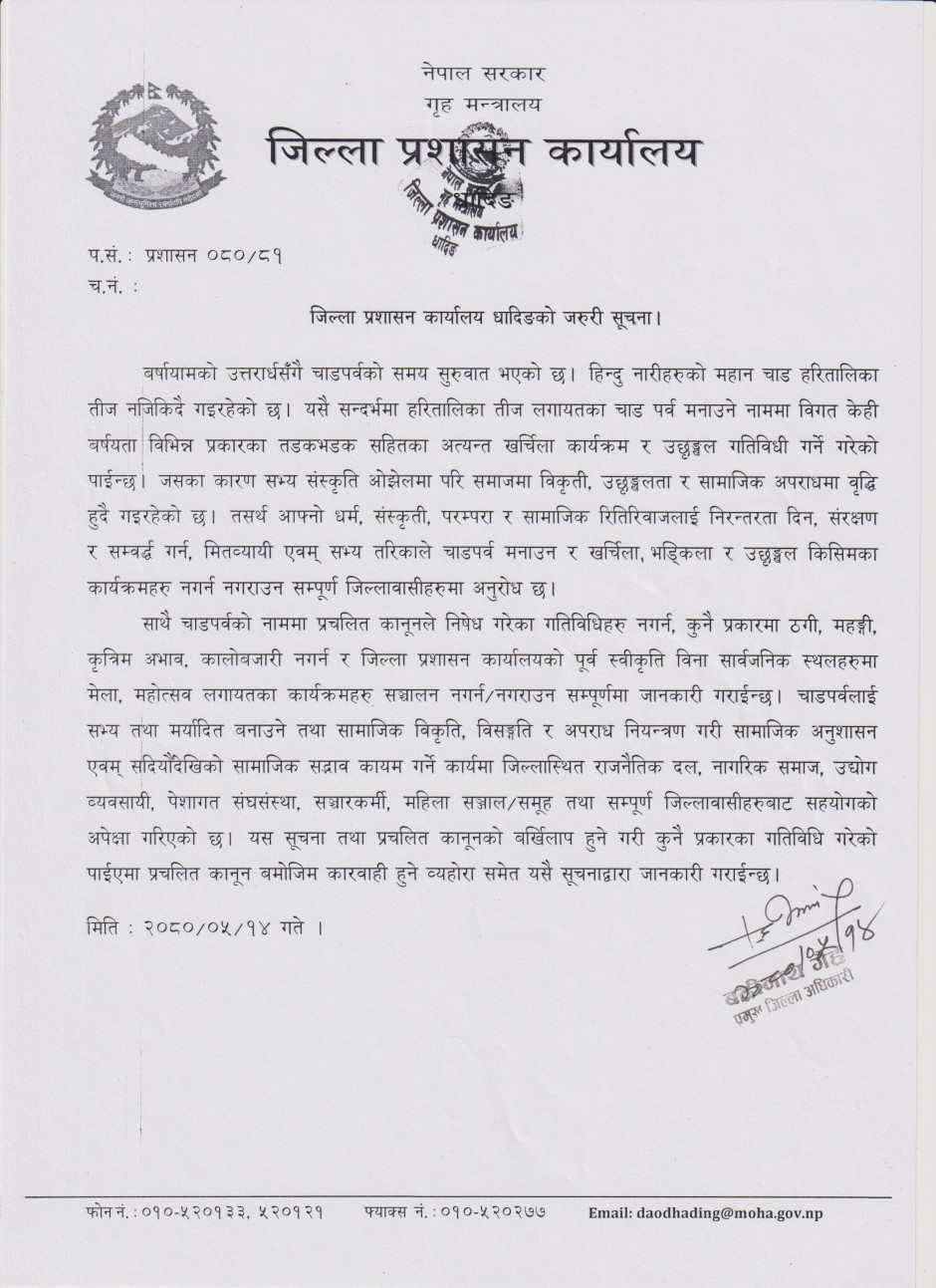 जिल्ला प्रशासन कार्यालय, धादिङद्धारा जनहितमा जारी सूचना ।
