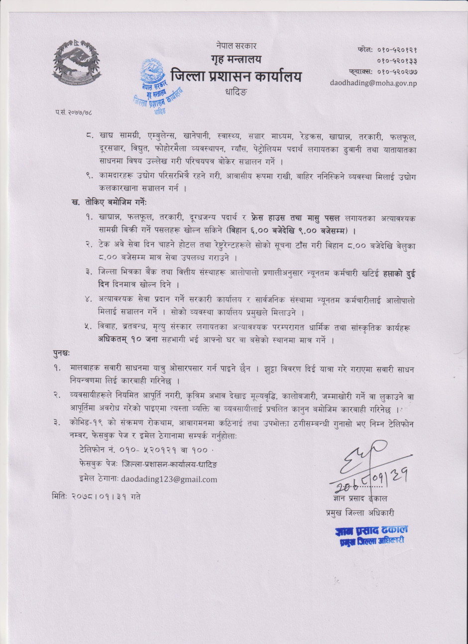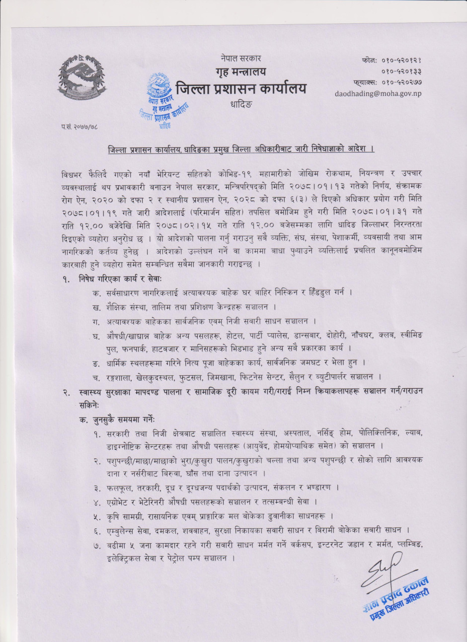 जिल्ला प्रशासन कार्यालय, धादिङका प्रमुख जिल्ला अधिकारीबाट जारी निषेधाज्ञाको आदेश