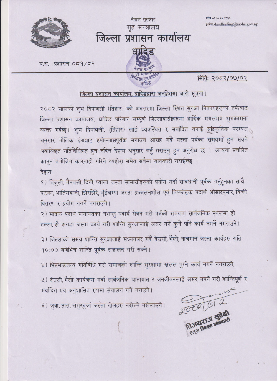 जिल्ला प्रशासन कार्यालय, धादिङद्धारा जनहितमा जारी सूचना ।