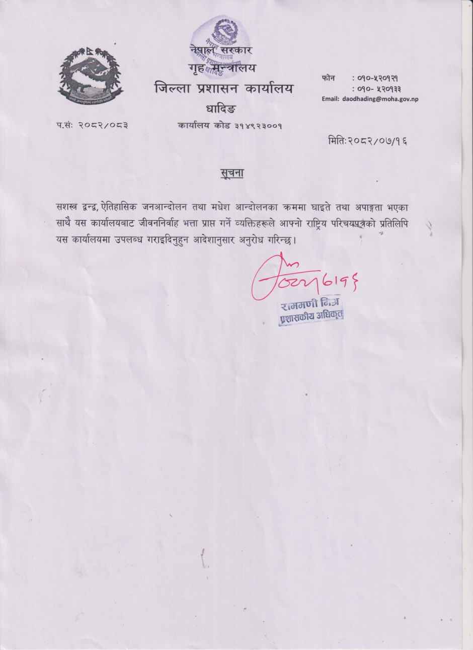 जिल्ला प्रशासन कार्यालय, धादिङद्धारा जनहितमा जारी सूचना ।