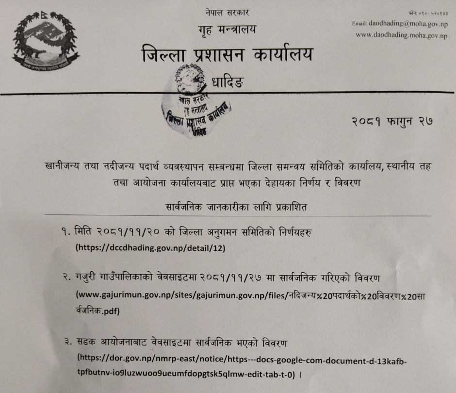 | खानीजन्य तथा नदिजन्य पदार्थ व्यवस्थापन सम्बन्धमा जिल्ला समन्वय समितिको कार्यालय | |
