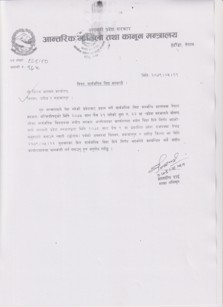 मिति २०७९/०५/२२ गते सार्वजनिक विदा सम्वन्धी सूचना