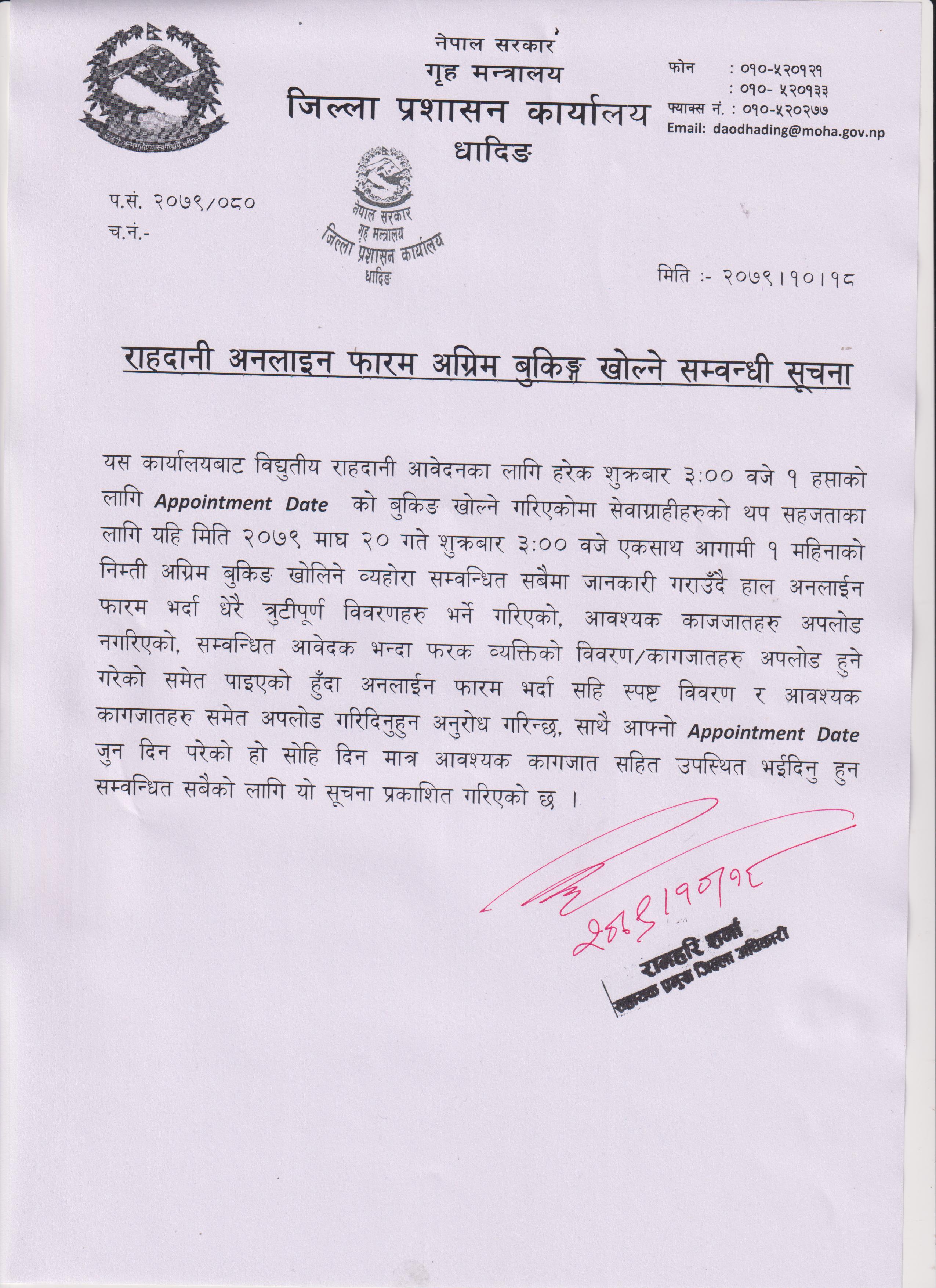 जिल्ला प्रशासन कार्यालय, धादिङद्धारा जनहितमा जारी सूचना ।