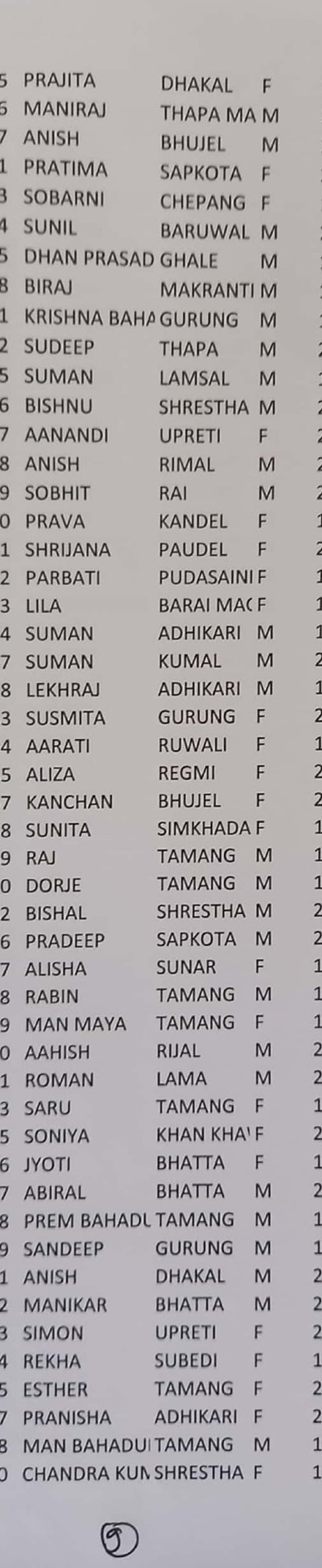 यस कार्यालयमा फारम पेश गरेका निम्न बमोजिमका निवेदकहरुको मात्र राहदानी प्राप्त भइसकेको छ । आफ्नो नाम थर एकिन गरेर पैसा तिरेको भौचरको अर्धकट्टी तथा नागरिकता वा पहिचान खुल्ने प्रमाणसहित स्वयम् उपस्थित भई आफ्नो राहदानी (पासपोर्ट) लिनु होला ।