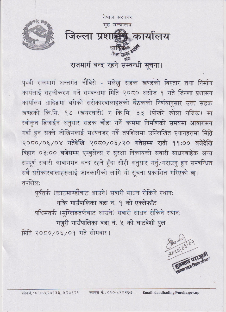 जिल्ला प्रशासन कार्यालय, धादिङद्धारा जनहितमा जारी सूचना ।