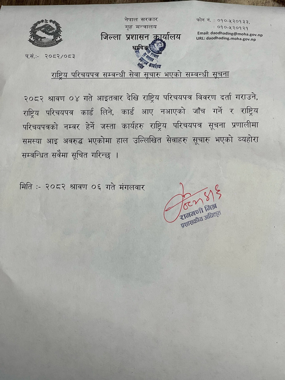 राष्ट्रिय परिचयपत्र सेवा सूचारु भएको सम्वन्धी सूचना ।