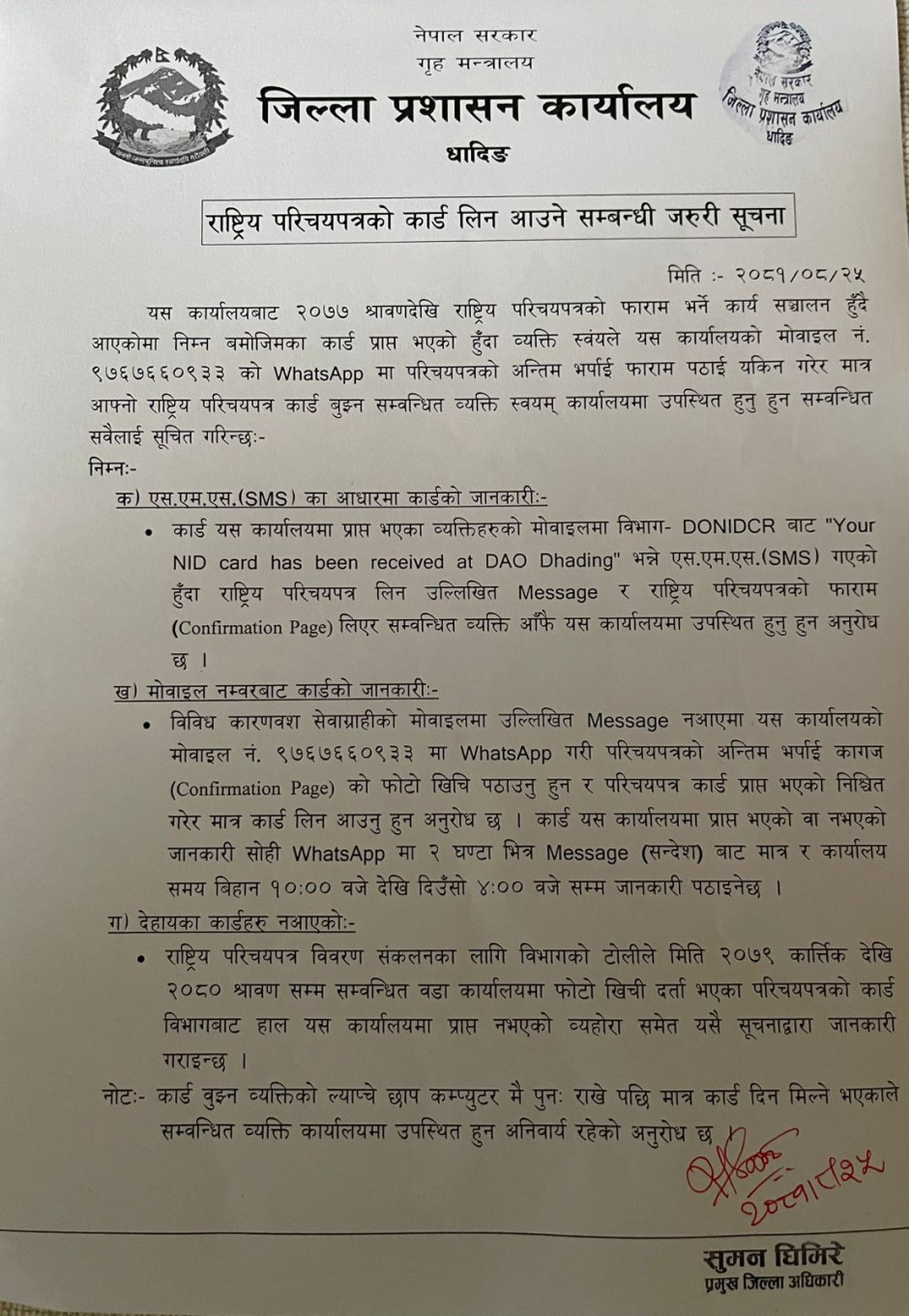 राष्ट्रिय परिचयपत्रको कार्ड लिन आउने सम्बन्धी जरुरी सूचना !