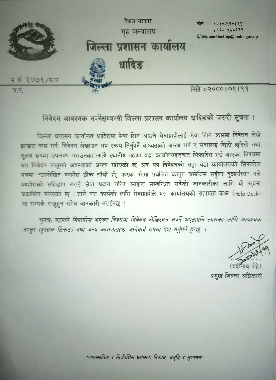 जिल्ला प्रशासन कार्यालय, धादिङद्धारा जनहितमा जारी सूचना ।