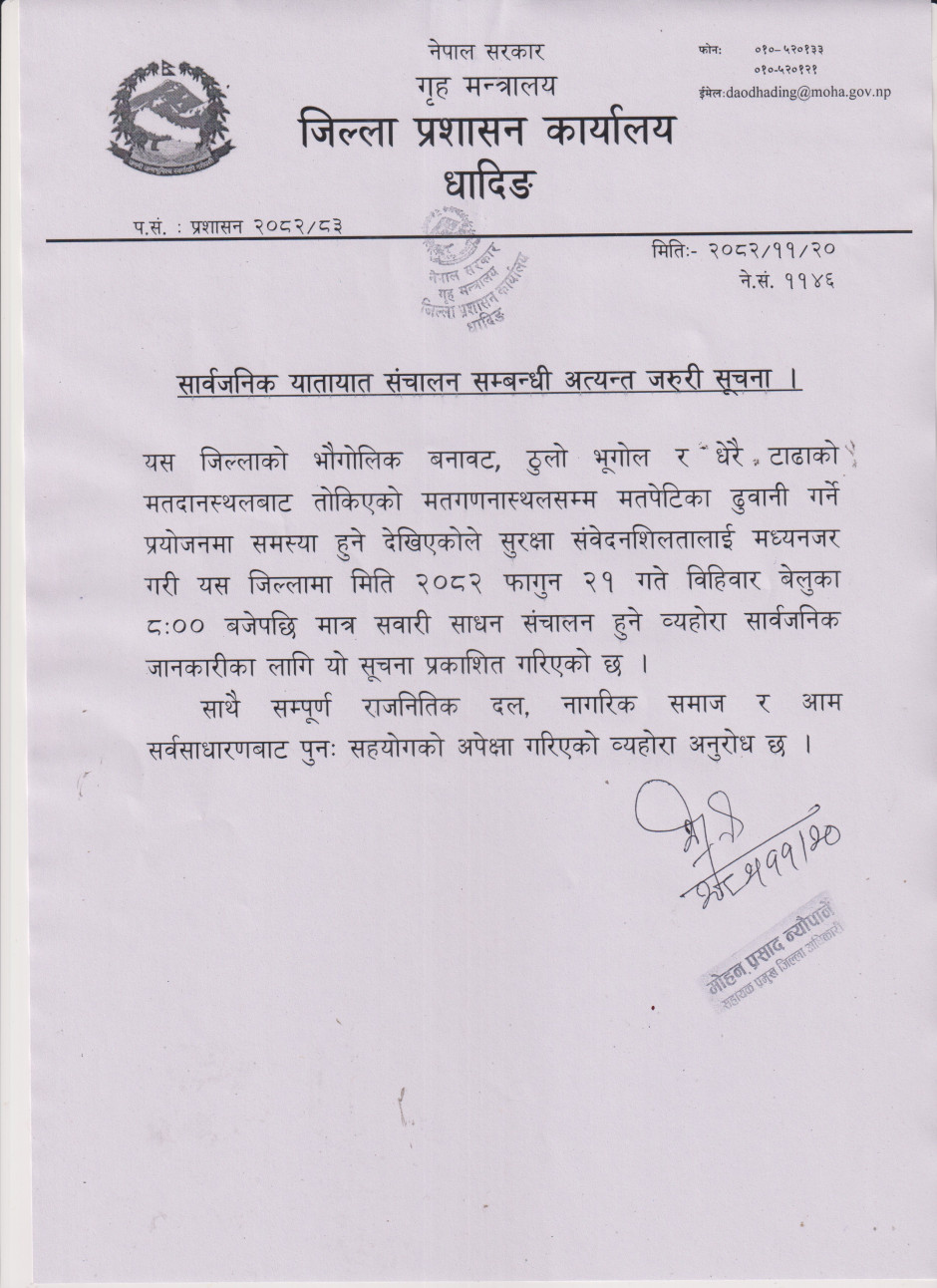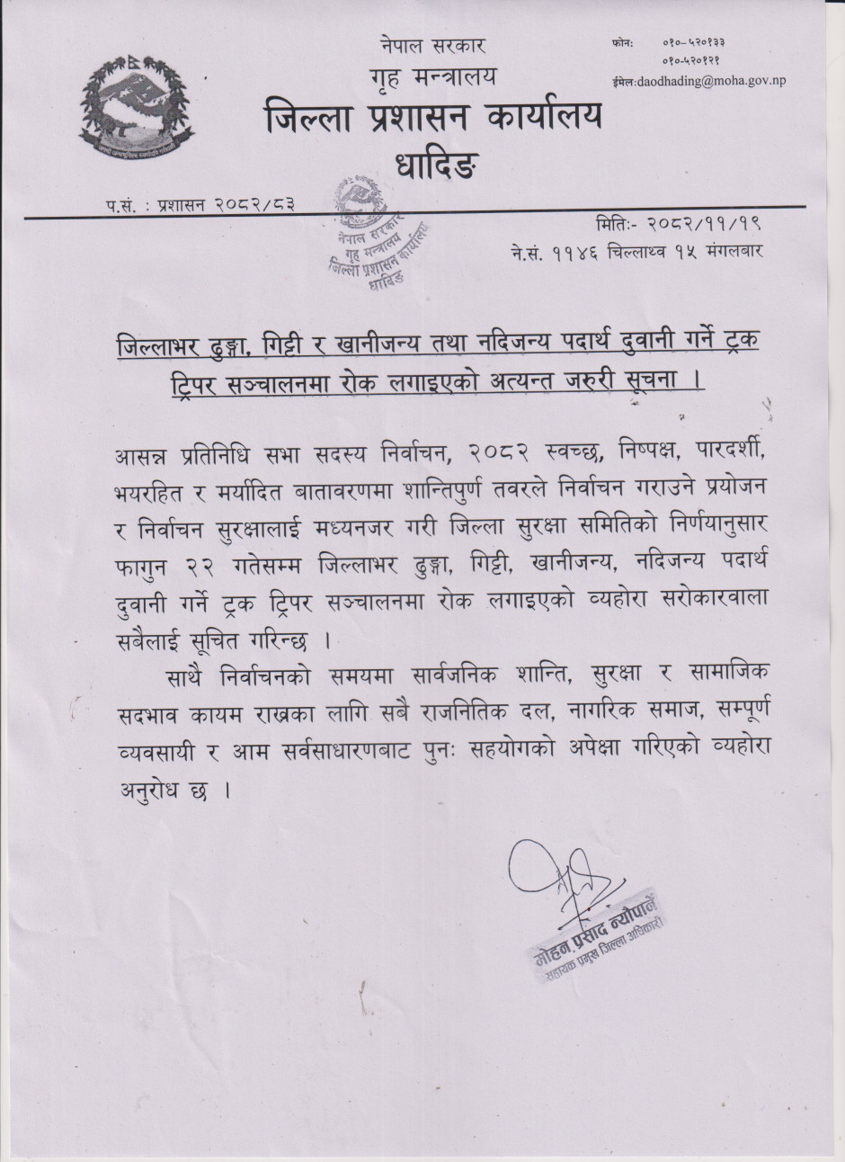 © सर्वाधिकार सुरक्षित जिल्ला प्रशासन कार्यालय, धादिङ