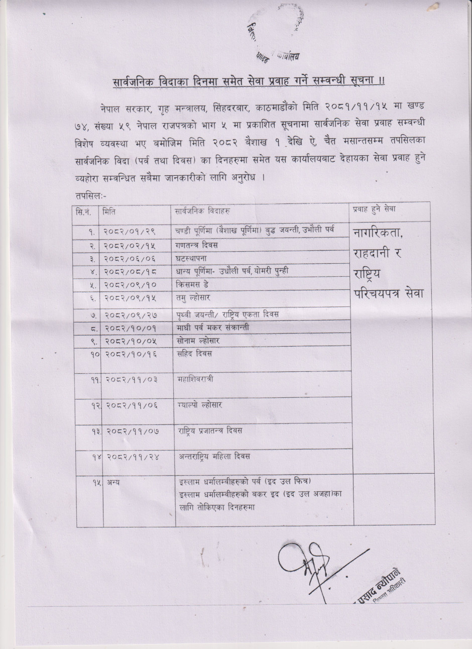 तस्बिर : सार्वजनीक विदाका दिनमा समेत सेवा प्रवाह हुने सम्बन्धी सूचना