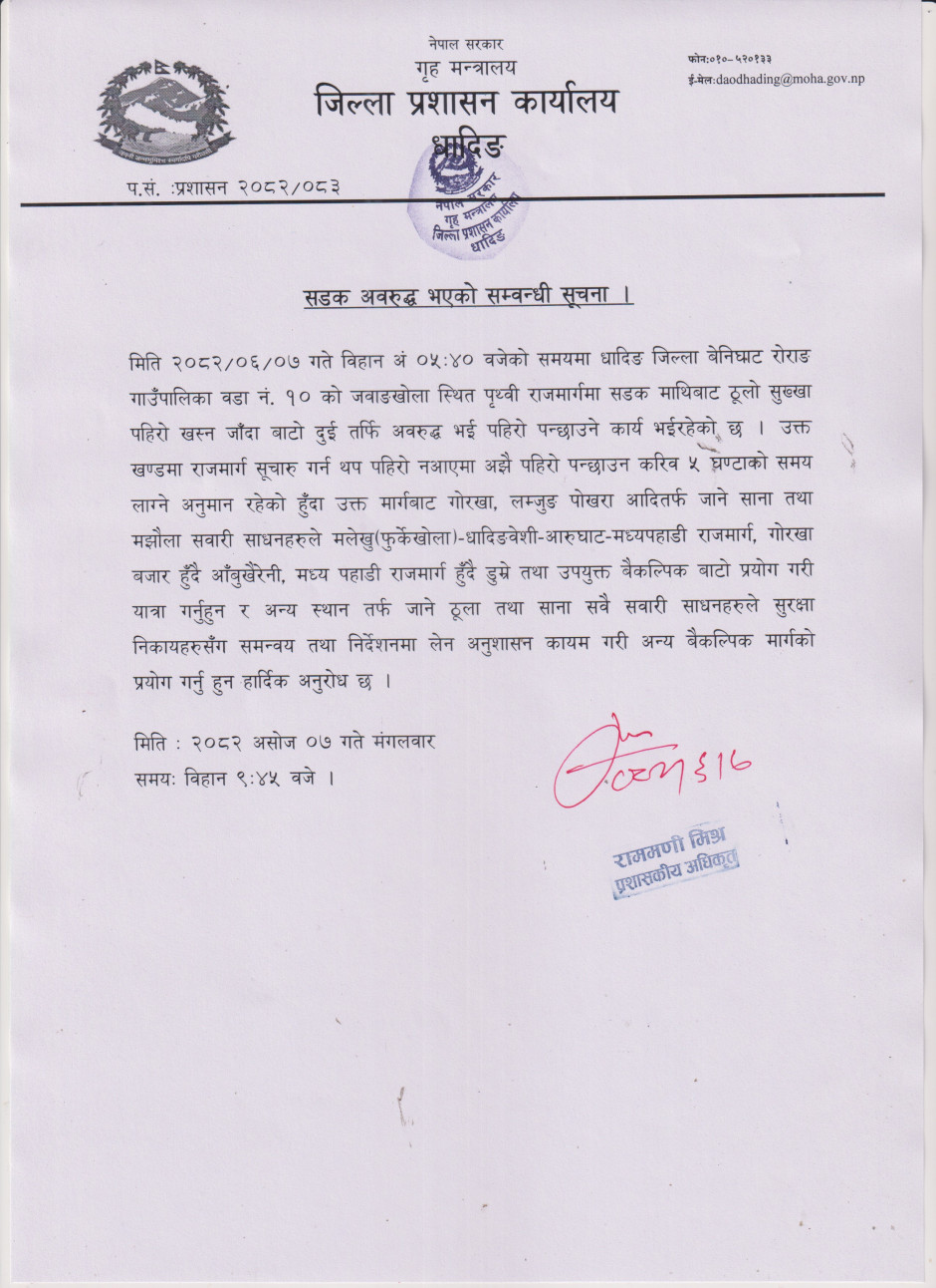 जिल्ला प्रशासन कार्यालय, धादिङद्धारा जनहितमा जारी सूचना ।