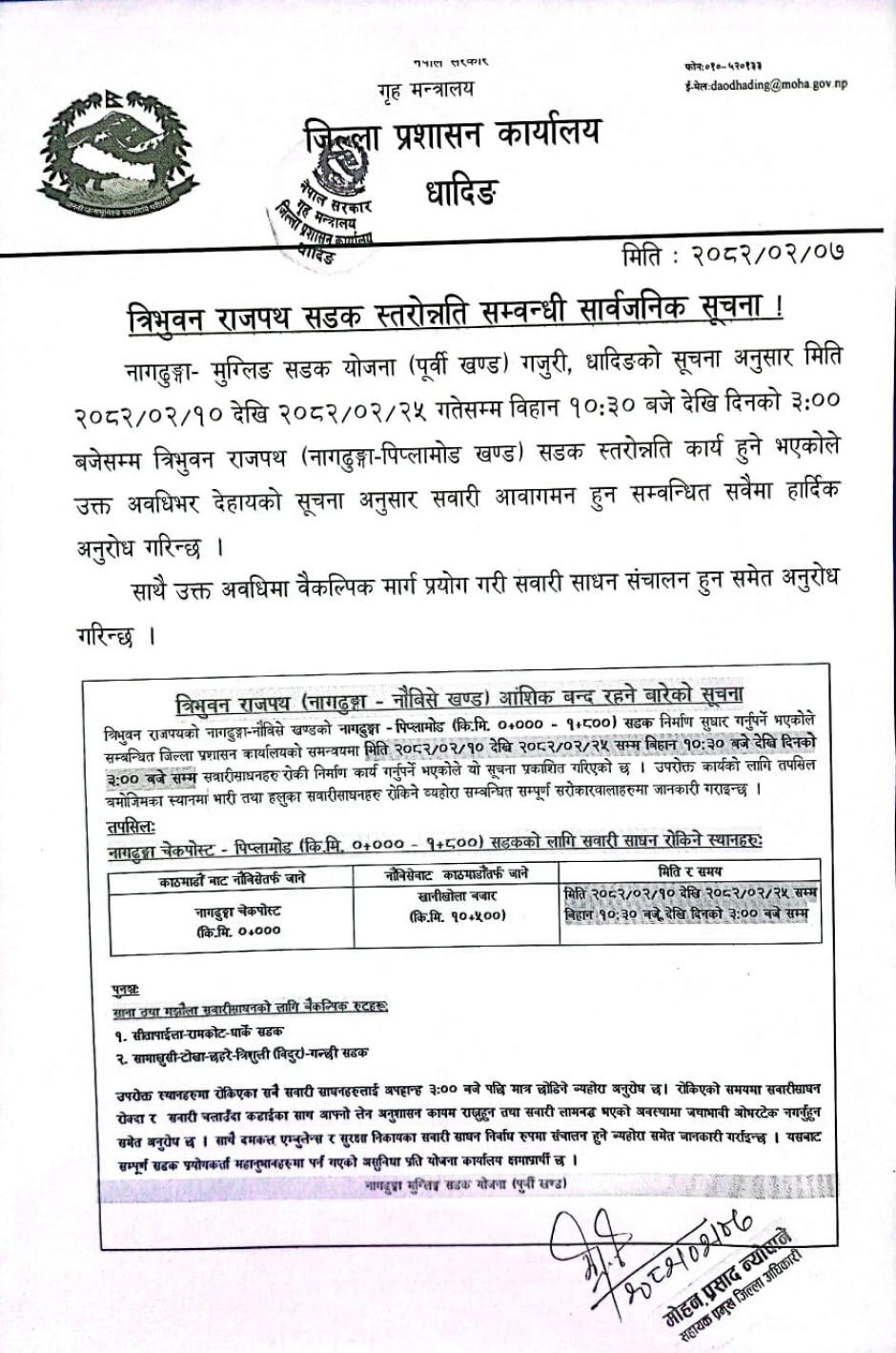 जिल्ला प्रशासन कार्यालय, धादिङद्धारा जनहितमा जारी सूचना ।