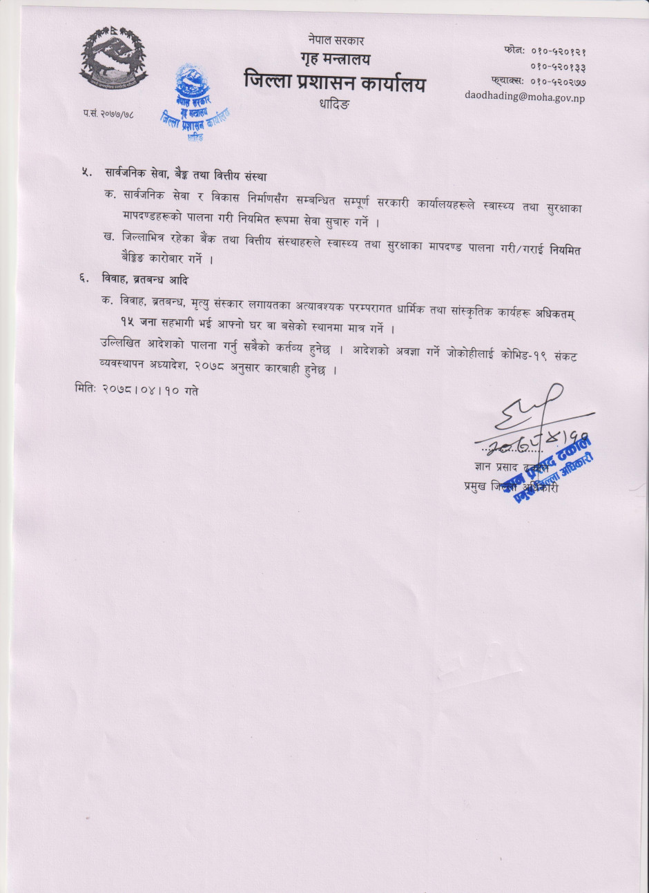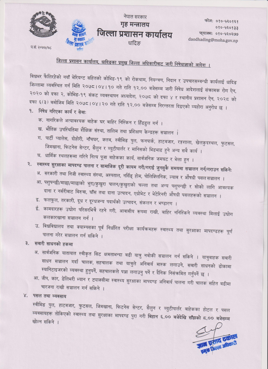 धादिङ जिल्लाका प्रमुख जिल्ला अधिकारीबाट जारी निषेध आदेश